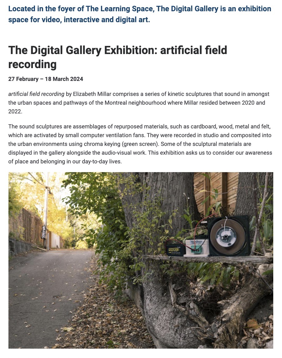 I began creating kinetic sound sculptures in 2017. These are assemblages of a variety of materials and recycled electronic components which generate repetitive, slowly-evolving soundscapes. In my work with these long-duration, textural sounds I became interested in how they paralleled field recordings or ‘environmental’ sounds, despite being made and recorded in the studio. I wanted to examine how we hear sound in our environment and qualify it as being ‘natural’ or ‘artificial,’ to encourage a connection with the spaces through which we move daily and experience them with fresh eyes and ears. In 2022 I created a series of sound sculptures for a variety of environments in my neighbourhood of Montreal. These responded to the sonic and visual characteristics of the place. They were then composited using chroma key into these environments. This work is currently in post-production.